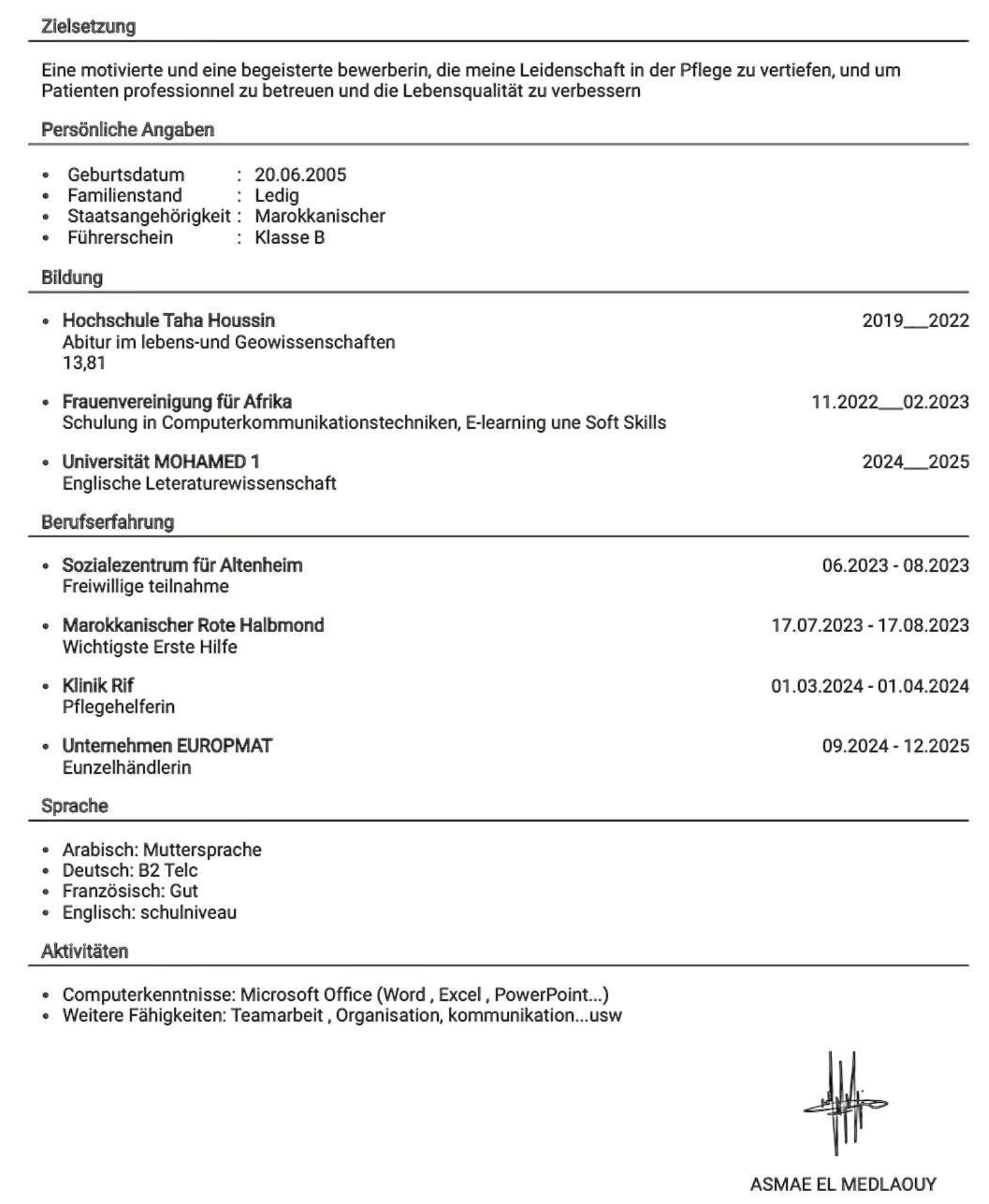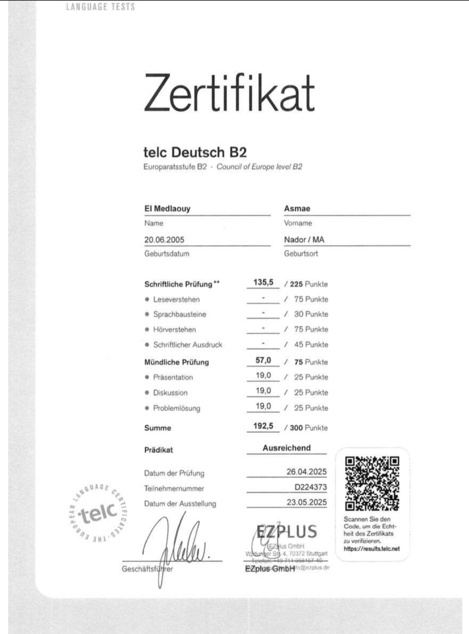 ich bin Asmae, komme ursprünglich aus Marokko und möchte gerne eine Ausbildung als Pflegefachfrau in Deutschland machen. Ich habe das Telc B2 Zertifikat im Mai 2025 erfolgreich erworben.